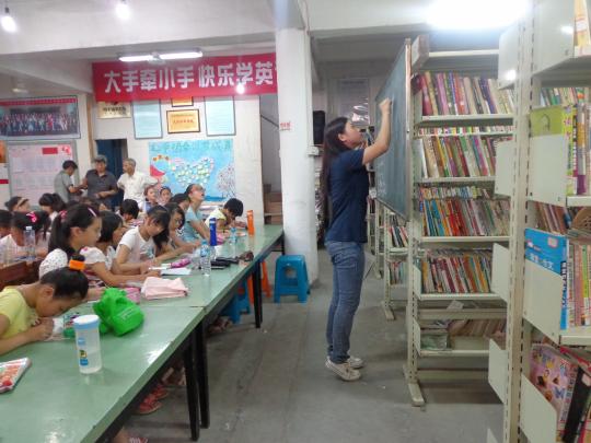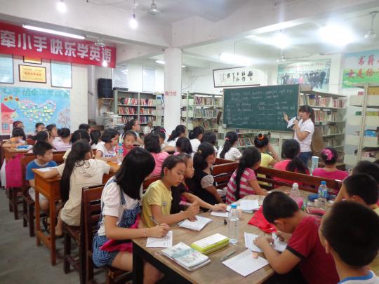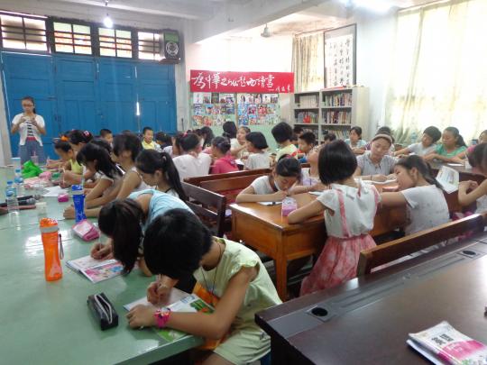 日的考试中取得好成绩,今天外国语学院的两名志愿者蓝毅娇和张素琴为孩子们安排了复习课的教学。