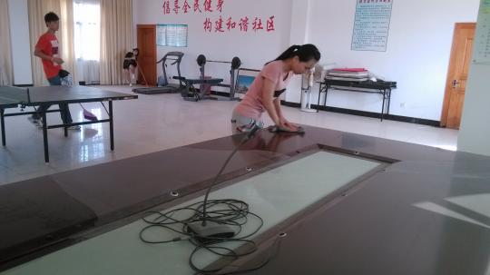 早上8点,小组一行12人到达闽侯岐安村。经与岐安村负责人沟通、协商后,8点30分同学们开始着手清扫岐安村健身中心和党员活动室。工作开始时,同学们虽有工作热情,却因为缺少合理分工而导致彼此不能兼顾。马上,同学们意识到问题所在。重新分配任务后,有的同学负责桌椅的挪动,另外的同学负责地板的清扫,还有的同学负责桌面等的擦拭工作。打扫工作对于同学们而言看似驾轻就熟,实则不但需要耐心细心,更要有明确的分工。正值酷暑,天气炎热,室温更是高达三十多度,不一会,同学们各个汗流浃背。在打扫过程中,同学们合作融洽、沟通得当,了解了作为队友的同学在学校外的另一面。终于经过一个多小时的打扫,活动室焕然一新。看着通过自己辛勤劳动而改变的活动室,同学们的脸上都浮现灿烂的笑容。10点左右,小组离开岐安村,结束一个上午的实践活动。
