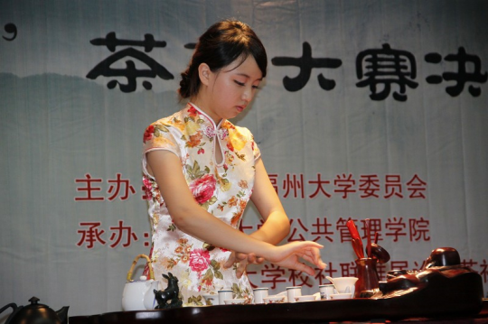 大赛一开始,六名身着粉色旗袍手持折扇的女子就上台进行了舞蹈表演。她们整齐优雅的舞姿立刻点燃了在场观众的气氛。舞蹈表演过后,选手们一一上台表演。每位选手都相应的有一位解说员在旁为其解说,便于观众理解茶艺的内涵。整个表演过程极为精彩,来自外国语学院的高雅彬同学和蓝晓燕同学伴随着解说员悠扬的声调,带着淡定从容的风度,以精湛优雅的手势为观众们展示了茶艺精髓,既有清新沁脾的铁观音,也有温润如玉的大红袍。表演进行时,整个大厅都萦绕着氤氲的茶香,全场观众沉浸在茶的禅意中。表演过后,高雅彬同学和蓝晓燕同学当场抽取题目回答问题,在考验选手综合素质能力的同时,也为在场观众普及了茶文化相关的一些小知识。大赛工作人员还设置了现场提问环节,并为回答正确的观众准备了精美的小礼品,极大调动了气氛。本次比赛采用评委意见占80%、现场观众投票10%、微博投票10%的评分原则,确保了比赛的公平公正性。最终,经过激烈比拼,外国语学院的高雅彬同学和蓝晓燕同学分别取得了二等奖和三等奖的优异成绩,为外国语学院增添了荣誉。