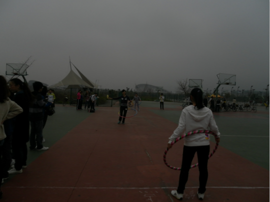 23日上午9时许,趣味运动会的宿舍系列赛开始。参加比赛的对象为外国语学院大一至大三全体宿舍。比赛分为三个部分:双人跳绳、踢毽子和摇呼啦圈。每个宿舍都积极参与其中并相互交流经验。队员们刚参加完呼啦圈比赛,马上又投入到双人跳绳中,而后又拿起毽子大展身手。此次宿舍大赛的项目可以考验宿舍成员之间的默契和团结写作能力,赛前的练习可以很好地磨合舍友间的默契,增进彼此的信任度。此次比赛气氛热烈,整个体育场热闹非凡,处处都能听到同学们欢快的笑声。