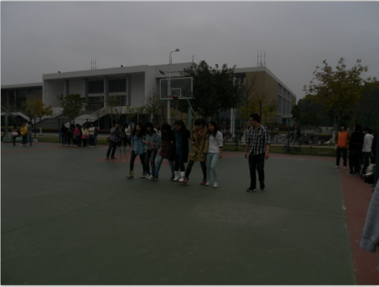 下午2时30分许,趣味运动会的班级系列赛紧接着拉开了帷幕。首先进行的是几人几脚的比赛,每组共六人参与,用绸绳将相邻两个人的脚绑在一起,比赛开始后,六人一起向前走向终点,用时越短者分数越高。赛前,每个班的同学都纷纷开始练习,在队员中寻找最有默契的六个人参与这项比赛。有的班级步调一致,默契十足,有的班级却略显生疏,加紧练习。整个赛场上“一、二、一、二”的口号声此起彼伏。几人几脚比赛结束后是背靠背比赛,两人一组背靠背运球并投篮。背靠背运球需要两个人配合默契,而投篮却需要技术加运气了。比赛中出现了许多出乎意料的结果。)最后进行的是跳大绳比赛,两人摇绳,六人依次跳进并跳出,线路为八字形。同学们一个接一个穿梭于长绳中,就像一场跳绳表演,看得大家眼花缭乱。她们娴熟的技巧和默契的配合赢得阵阵掌声。最终综合三项成绩,10级英语三班力压群雄夺得桂冠,11级日语一班夺得第二,11级日语二班位列第三。