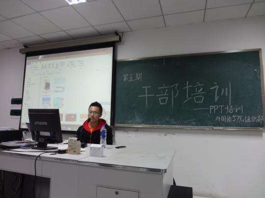 3月23日晚6时许,由外国语学院组织部主办的第五期干部培训之PPT培训在院办口译实验室开展。本次培训邀请11级日语1班张玮毅同学前来主讲,内容涉及PPT制作的技术与技巧、如何评判一份PPT的优劣等等;培训对象为各个部门的部员、部长以及各个班级的班委。