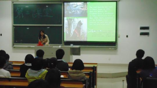 虽然天公不作美,但是同学们对第二课堂的热情丝毫没有受影响,大家冒着雨纷至沓来。本次第二课堂全程用英语教学,由英语口语协会的副部长王语嫣同学主讲,向同学们介绍正确利用电影资源学习英语的方法,即在观看英语电影的过程中对比文化差异、增强英语语感。她还向同学们提出,坚持看纯英文字幕,在观看电影过程中注意台词而不是剧情等几点有建设性的建议。同时,王语嫣同学还向同学们推荐了几部适合训练口语、有益于区分英式英语与美式英语的影视剧作品。随后,她组织同学们观看电影《忠犬八公》。在影片放映结束后,同学们积极踊跃地用英文表达了自己的观后感,借此锻炼了自己的口语,实现课堂的互动。