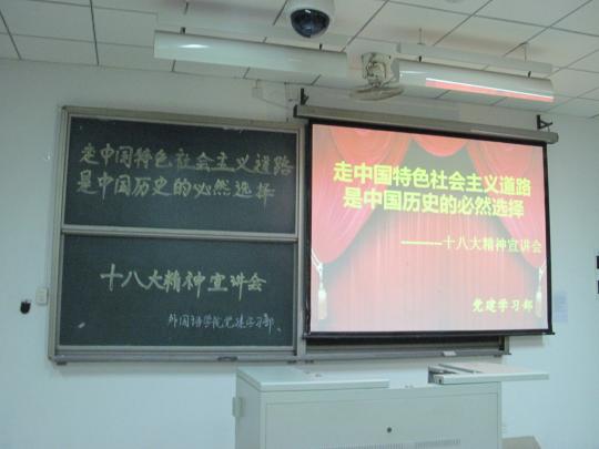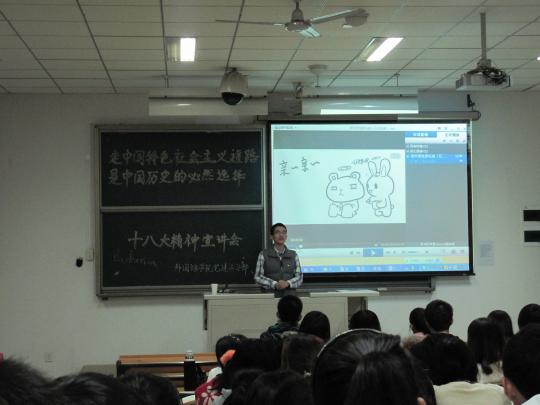 7时整,一场旨在关注十八大,弘扬十八大精神的“十八大精神外国语学院宣讲会”在文