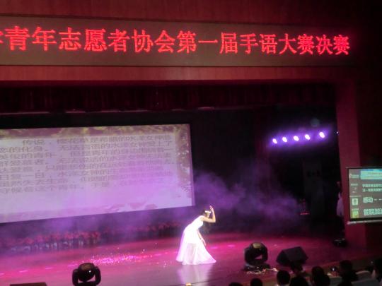 7时许,博学厅内座无虚席。在热辣动感的街舞表演以及福利院小朋友带来的手语歌曲表演《幸福的脸》后,现场迅速升温,比赛也随之拉开帷幕——进入各个代表队的手语表演环节。将搞怪或温馨的情景剧与手语相结合是大多数学院选择的表演风格,而外国语学院promise队伍带来的节目《樱花草》则比其他学院的表演略显浪漫。表演者们统一着飘逸白裙,用手语和舞蹈相结合的方式讲述樱花草由来的神话传说:无法言语的水泽女神爱上了英俊青年,直至她失去生命,爱却依然守候,于是,在她死去的地方,长出了樱花草。熟练优美的手语表演,唯美动人的舞姿,默契无间的演出,不仅给观众带来美的享受,也完美诠释了爱的含义。最终外国语学院代表队从众多学院参赛队伍中脱颖而出,获得第一名。另外,管理学院和物信学院获得二等奖。