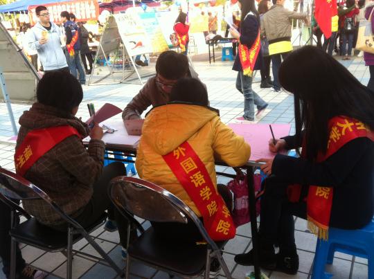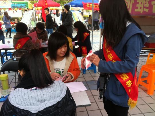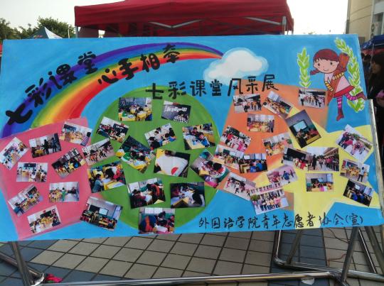 青年志愿者协会的带领下有序开展志愿者日活动。活动形式多样,内容新颖。其中,外国语学院关爱农民工子女的系列活动紧紧围绕“心手相牵 助力成长”的主题,通过“‘七彩课堂 心手相牵’——七彩课堂教学系列成果展”、“‘心语心愿 助力成长’——温馨传递祝福”两项活动,展示了美岐小学兴趣小组课堂教学风采图片、学生笑脸图片、学生优秀手工制作作品、儿童画作品,令人印象深刻;而以新媒体手段及现场制作手工、手绘写祝福等方式表达对农民工子女的关爱吸引了不少路人驻足参与。活动现场气氛宽松融洽,志愿者们都尽自己最大的努力传递爱心。