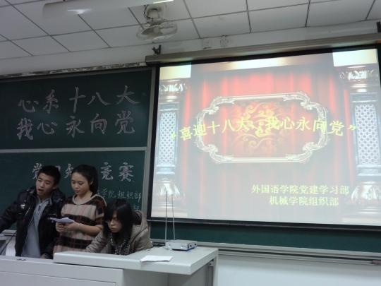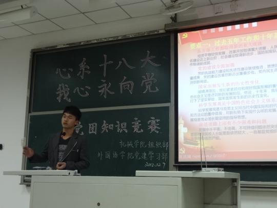 为热烈庆祝党十八大胜利召开,为树立当代学生永远跟党走的坚定信念,加强党员的党性修养,由外国语学院党建学习部、机械学院组织部联合举办的“心系十八大,我心永向党”党团知识竞赛于12月7日晚7时许在文2-405如期举行。此次活动参与者主要为外国语学院、机械学院12级的入党积极分子。活动邀请了外国语学院10级党支部负责人苏梅芳和机械学院团委副书记陈明荣作为主讲人,以及外国语学院和机械学院的学生会主席团成员作为嘉宾。