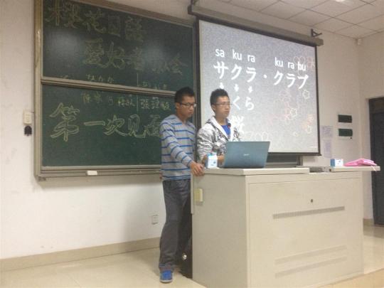 简单的日本语教学由樱花日语爱好者协会部员张玮毅主讲、陈家何助教。张玮毅同学日语基础扎实,日语发音标准,并且为了这次日语教学特意制作了ppt及教材。他新颖的教学方法极大地吸引了会员们的注意力,调动了在场会员的积极性和参与度。大家学习都非常认真,甚至有会员拿起手机进行录像,以备日后复习之用。本身略显枯燥的教学环节在张玮毅和陈家何风趣幽默的讲解及参与会员的互动下变得十分有趣,在场会员时不时发出阵阵笑声和叫好声。