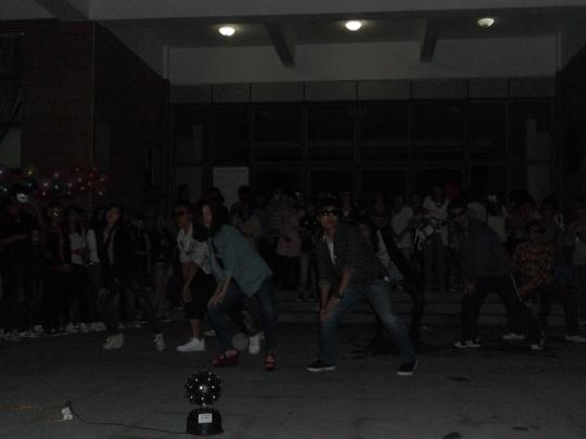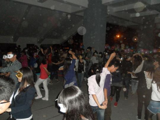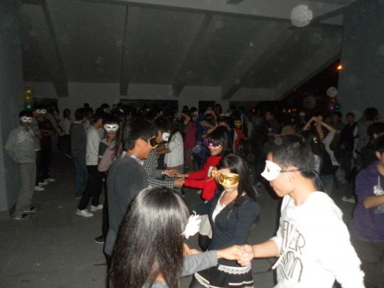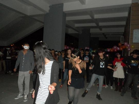 19时许,随着熟悉的旋律声响起,外国语学院文化部以《江南Style》拉开了舞会的序幕。热情奔放的舞步,搞笑却不失文雅的舞姿瞬间点燃了现场的热情。在轻松愉悦的《快乐崇拜》之后,动感十足的《So Crazy》引来了舞会第一场重头戏——双人舞。男、女生们迅速组成拍档,跟着富有感染力的节奏旋转,在和拍档的默契配合中享受音乐带来的激情、快乐。随后,酷玩表演的24步舞蹈、双人恰恰等节目一次又一次拨起舞会的高潮。下半场的交谊舞也在众人期待的目光中上演,流动的灯光交换地照在舞伴的脸上、面具上,让舞会增添了些许浪漫妖媚。假面舞会最终在温馨俏皮的《爱你》画上了圆满的句号。
