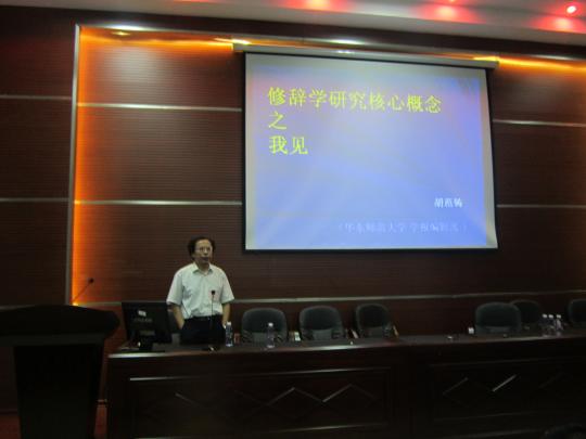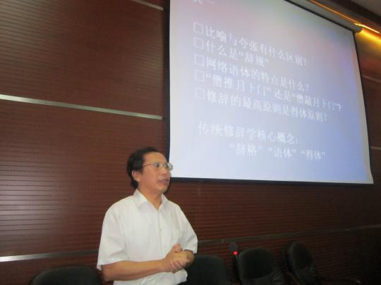 此次会议邀请到我国著名应用语言学者、复旦大学《当代修辞学》(中国语言学核心期刊)副主编、中国修辞学会副会长胡范铸教授为外国语学院师生论述其对学术的见解。胡教授首先提出了“为什么要做学术,怎么做学术”这个问题,他举出贾岛月下推敲的例子,引经据典,生动形象的诠释了做学术需要认真钻研这一观点,引起了台下观众的共鸣与沉思。讲座中,胡教授围绕语言运用有效性问题所作的多维度分析,让师生们看到了语言分析的广阔空间,引发了我们对修辞问题的深层次思考。观众们一边认真聆听,仔细思考胡教授提出的问题,一边认真做笔记,总结归纳胡教授的观点。同时胡教授积极与台下观众互动,使老师和同学们兴趣盎然,整个会场气氛十分活跃。
