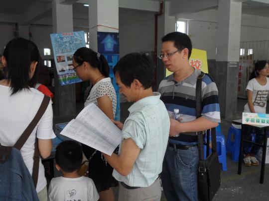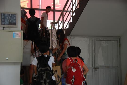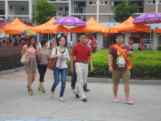 为了让新生更好地适应大学新生活,学院依照往年旧历安排对应宿舍,方便新生在遇到难题时能够向有经验的学长或学姐进行咨询。11级同学不仅在对应宿舍门上贴上自己的联系方式,还备注上对新生的祝福和提点,宿舍楼充满着外院家一般的温馨气息。在前期紧张的部署和安排过后,迎新工作有条不紊地开始了。从上午6时起,学院安排学生分别安排在一区、三区、13号楼接待新生。在生活一区和三区大门口,迎新的同学会举牌引导新生到大本营领取宿舍信息条,随后带领新生及家长们到13号楼架空层报到。报道当天,外院团委书记倪朝兴、副书记刘旺、柯集老师、王春雪老师以及辅导员也亲临现场指挥,确保工作顺利进行。