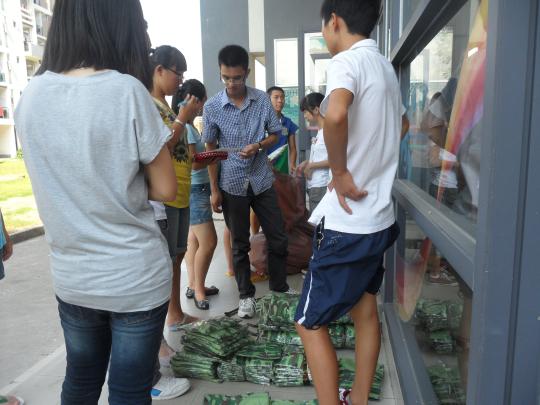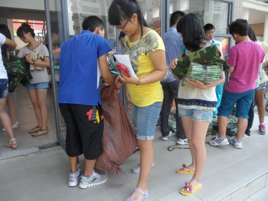 号楼一楼大厅,领取各班军训所需用品,包括军训的套装、军鞋、军帽、领带、手套等,各班负责人组织同学有序领取,现场秩序井然。晚上