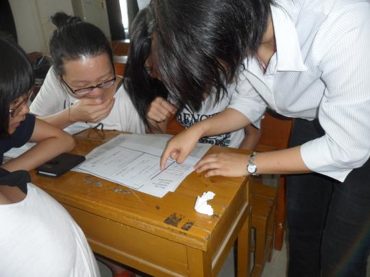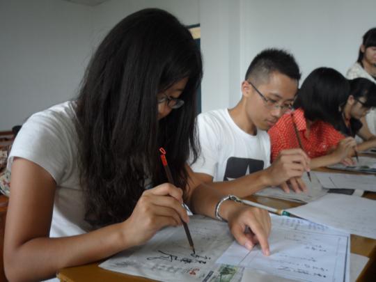 所谓书道,其实与中国的毛笔文化相类似,也是利用毛笔来书写文字、陶冶性情。活动伊始,守屋老师向大家讲了自己学习书道的趣事以缓解气氛。接下来,她向同学们分发了打印的日本小诗并附上毛笔手写字。学生们对其上的文字很感兴趣,立即拿起铅笔就描摹起来,守屋老师也进行了一对一的辅导。当大家对文字有所熟练后,守屋老师就让大家用毛笔蘸上墨水书写,同学们低着头认真写字。老师也不失时机提点同学。