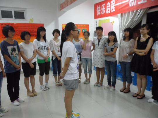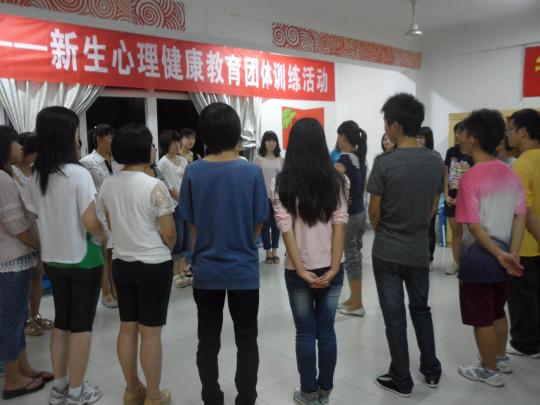 楼活动室开展了外国语学院快乐启程—学生心理团训活动,此次团训活动由外国语学院心理健康部主办,活动邀请到了辅导员黄柑莲老师和校心理健康中心的老师黄瑞枫。团训开始,所有参加团训的新生围成一个圈,在黄瑞枫老师的指导下开始心理小游戏。通过小游戏原本不熟悉的同学们慢慢认识对方,游戏过程中充满欢声笑语,气氛高涨。