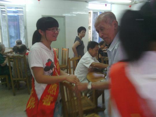 也许是因为知道马上就要离开这些可爱可敬的老人们,一进大门,同学们的眼里都流露出不舍之情。接下来的打扫工作里,大家虽然话都不多,但都很卖力地清洗,希望这最后一次的大扫除能够给老爷爷、老奶奶们带来一段时间里相当舒适的环境。不少同学在回来途中回想起和老人交谈的过程,她们动情地说老人们和煦的微笑一直温暖着自己,这份感动和热情她们将会永远留在心中。有的老人还带着志愿者参观自己的宿舍,这份信任也让同学们十分感动。至于那个喜欢下棋的爷爷,一起去的志愿者与他对弈时连输了三盘。老爷爷虽然不善言语,但给人感觉是一个有想法的老人。他会教导一下志愿者们下棋,也不会点破在旁观战者的指导有何不妥。志愿者的活动直到午餐时间才结束,大家搀扶着老人们进食堂,看着老人们津津有味地吃着,志愿者们才恋恋不舍得离开,结束这一暑假的社会实践活动。