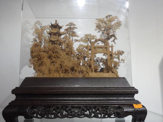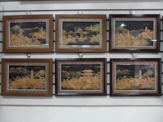 结合的手工艺品。一踏入商铺中,小分队成员就被软木画独特的艺术风格和浓厚的民族特色所吸引,她们近距离观察了这种产于欧洲地中海沿岸西班牙、葡萄牙等国的栓皮栎树的木栓层,不禁感叹福州民间的能工巧匠们精湛的雕刻技艺。制作者利用软木质地轻软、纹理细密、色调柔和及易于用刀的特性,运用中国传统的民间雕刻技艺,以刀代笔,将软木精心雕镂成中国画式的形态各异的亭台楼阁、花草树木、虫鱼鸟兽等零部件,再根据创作题材的具体需要,将这些零部件有机地组合成一幅完整的景观,从而使得中国民间精湛的雕刻技艺与中国绘画那优美而深远的意境巧妙而完美地结合起来。在参观博物馆的软木画专区时,小分队成员更是对软木画作品啧啧称奇。她们表示,软木画看起来似乎只是轻松的案头工艺,可做起来真不容易,一幢楼阁中的窗棂、椽子、柱子等都细若发丝,密密的屋瓦也不足一厘米,而松树的松丝更是细超发丝,能工巧匠们如果没有足够的细心和耐心是完不成如此繁杂的作品的。