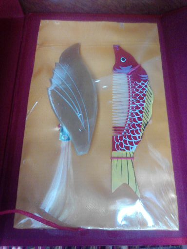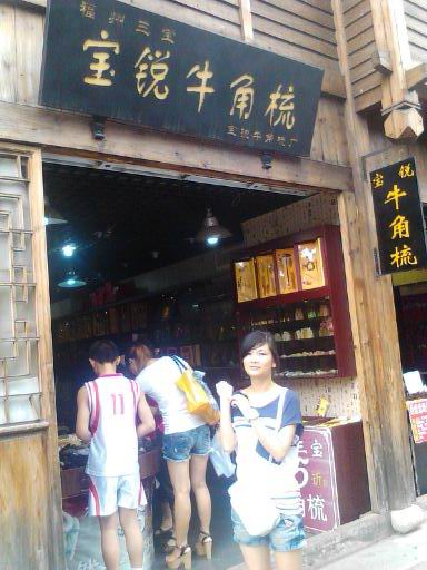 作为福州三宝之一的牛角梳,在南后街的商店里可谓畅销货。小分队先后参观了专卖牛角梳的“恒利牛角梳”店和“保锐牛角梳”店,仔细欣赏了店内造型各异的牛角梳,其精美的造型与适中的价格吸引了不少顾客前来选购。在与店长的攀谈中,小分队成员了解到,牛角梳的原料选择是有讲究的,牛角梳,顾名思义,是以牛角为原料,采用传统的工艺手工制作而成。牛角梳材料有水牛角、黄牛角、牦牛角,绵羊角,山羊角、螺丝羊角等。好的牛角梳手感温润厚实,牛角色泽圆润,手感好,不起静电。牛角梳不仅外观典雅耐看,更具有保健功能。每天用牛角梳头数次,可以起到按摩大脑头皮和头部神经,促进血液循环,放松紧张和疲劳情绪的作用,因此深受群众喜爱。在参观了多家牛角梳专卖店后,小组成语还发现了各个专卖店的共通之处,其一是店铺里都装饰着巨大的霸气的牛角,其二为牛角梳都被包装在奢华的礼品盒里,可见其作为礼品的受欢迎程度,其三则是牛角梳除了有寻常样式,一部分还被雕琢成或活泼的动物形象或精美的图案,趣味十足。