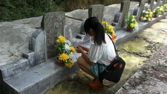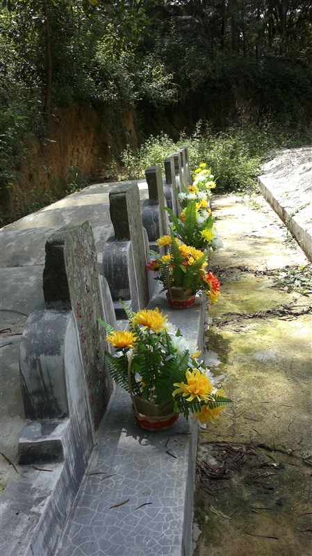 此地的革命烈士陵园只有在清明节才开放,而与当地陵园管理者不能联系上,因此队员费了一番功夫从陵园废弃的围墙翻过才进入烈士陵园。进入烈士陵园里,首先进入眼帘的是密密麻麻的树木和丛生的杂草,地上没有明显的小径,可见平时来此祭扫的人很稀少。走过一座座杂草丛生的墓地,队员来到陵园。陵园里不是和刚才走过的墓地一样的衰颓景象,这里的烈士墓整齐的排列,但是由于有一段时间没有人前来打扫,墓前便留下了风雨扫过的痕迹。队员们不忍心看着曾经抛头颅洒热血的烈士们坟墓前景象如此阴霾,于是为烈士墓扫去风雨的“脚印”,将黄色和白色的花小心翼翼的放在墓前,并为之默哀和悼念。