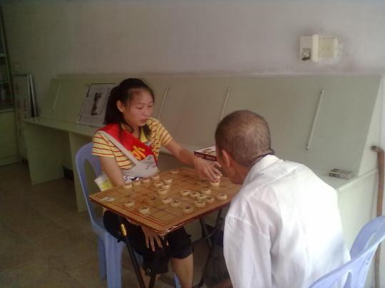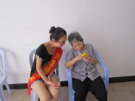 此次敬老院之行志愿者们别出心裁地决定事先了解了老人们儿女的电话号码。在活动当天,志愿者们纷纷掏出手机让老人们和自己的儿孙们聊聊天。当院子里这一块那一簇地响起手机拨号声,当电话那头传来久违的儿女们嘘寒问暖的问候,老人们布满皱纹的脸颊犹如绣上一朵鲜花般灿烂,不停地让儿女们放心自己这的生活一切安好。志愿者们则静静地站在一旁,听着老人们略微激动的声音,分享着老人们的幸福和快乐。一通通的温馨而又温暖的对话之后,志愿者们就开始活动起来。有的牵着老奶奶的手在屋子里坐下聊天,有的陪着老爷爷在活动室里下棋,直到晚餐时间,同学们搀扶着老爷爷、老奶奶们走进食堂,一一和老人们道别。老人们一声声的“谢谢,有空再来”让志愿者们倍感不舍与感动,在一阵挥手里,志愿者们才依依不舍地离开了敬老院。