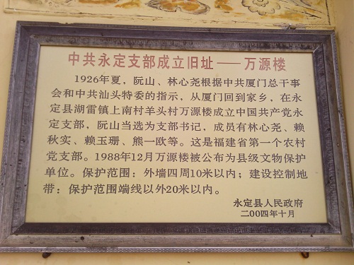 中共永定支部位于福建永定县湖雷镇上南村,是一座土木结构的农家宅地,名为“万源楼”。走进院子,楼前有一方天井,天井两边各有厢房数间,整座楼院看上去灵秀小巧。楼内共设有八个展厅,其中包括阮山等人的展厅。在各个展厅内都可以看到当时珍贵的图片文字资料,还有阮山作的一首《救穷歌》。在这里,队员们细致的参观了展厅的环境布置,并讨论着当年革命先辈在此时的情景。二楼大厅内挂着列宁和马克思的画像,还摆着一张四方桌,一套茶具,好像他们还在慷慨激昂地筹划革命大事。从文献上得知,那是1926年初夏,阮山、林心尧等人受党组织委托,满怀热血,从厦门秘密返回永定,在 “万源 楼”成立了福建省第一个农村党支部——中共永定支部。阮山当选为书记。 此后,中共永定支部采取边培养、边教育、边发展的方针,不断壮大党的地 方组织。当年雄心壮志的儿郎早已不在,只留下他们用热血换来的太平盛世,还有这小小的万源楼,身处其中,感受着那里的气息,好像自己也参与啦当时的一切,不禁感慨万千。
