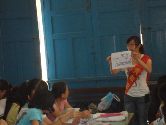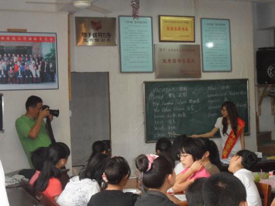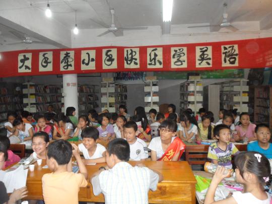 快乐学英语”的横幅。上课开始后,主讲老师便带领学生们复习了前一天所学知识,学生们积极回答提问。接着老师开始教授新的内容,学生们一丝不苟地抄下板书并跟着老师念单词,听着老师讲解释义。安插在学生中的辅导老师们可也没闲着,他们为学生纠正发音,和他们一起朗读课文。为了达到快乐学习的目的,老师设计了一个小游戏。老师请上各组代表,让他们背对黑板,而老师则在黑板上写上单词,让在座的学生用肢体表达意思,再让代表们说出这个单词,以说出数量最多者为胜。这个游戏充分调动了大家的积极性,课堂气氛顿时活跃了起来。