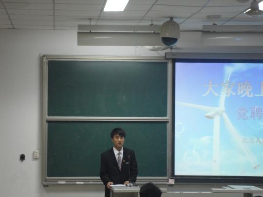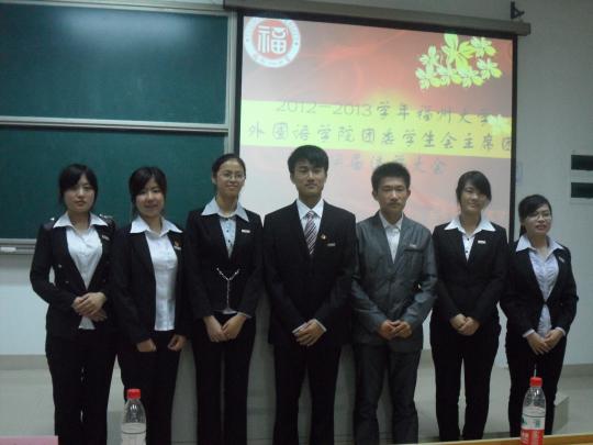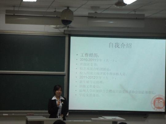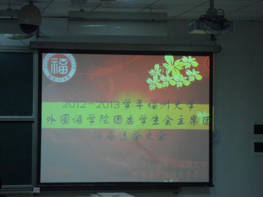 5月28日晚上6时30分,在全院师生的关注下,由外国语学院学生会两委办主办的“2012——2013学年团委学生会主席团学生会换届选举大会”在文1—404隆重举行。此次换届选举有10级陈冬冬,郭馨,黄玉洁,王丹凤,肖凌,张馥霖,张心宇七位选手参赛。担任此次换届选举大会的评委有外国语学院团委书记周越、辅导员黄柑莲和刘文婷,学院各主席团成员亦应邀出席此次大会。
