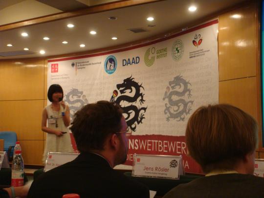 、厦门大学和中山大学等五所华南地区高校参赛。来自各个学校的参赛者以抖擞的精神面貌和流利的德语,一一为大赛献上了精彩纷呈的想法和规划。外国语学院欧淑平同学提出的未来城市生态摩天大楼构思吸引了在场所有人的注意力。她介绍道,这些摩天大楼不同于现代意义的摩天大楼,它们是以生态的理念和环保的概念建造起来的,目的在于解决人口日益增加、可用土地面积日益减少的问题。而张馥霖同学则以一个德国小男孩的视角,描绘50年后厦门的模样,并通过现实和理想的对比,告诫人们要活在当下,保护好周围的生态环境,为大家共同的未来负责。两名参赛者均获得优秀的成绩,其中欧淑平同学排名第三荣获二等奖,张馥霖同学排名第七荣获三等奖。赛后,她们表示此次比赛最大的收获就是结识了许多同样爱好德语的同学,并能够在相互切磋交流的同时了解到自己的不足之处。