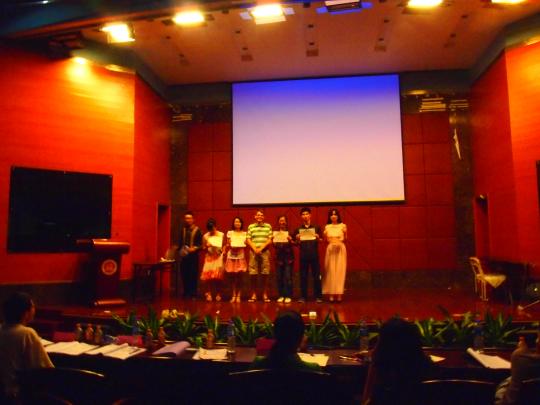 首先,来自英语一班的一个小组的《The million of a pound》以华丽的服装、标准的语音、唯美的伴奏顿时吸引了全场人的眼球,剧中主角将那个得到百万英镑的年轻人演绎的活灵活现,台下不时爆发出阵阵掌声。紧接着《Never give up》讲述了一个热爱舞蹈的女孩为梦想努力追求,锲而不舍的故事,激发了在坐的同龄年青人的满腔热情。而《Kaernaiyadis' board》风格截然不同,讲述了大学里的复仇以及侦探潜入大学缉拿凶手的一系列曲折的故事,场景变换时而轻松活泼事儿神秘诡异,步步扣人心弦,台下观众都屏住呼吸睁大双眼,生怕错过某个精彩的细节。随后《Mystery of love 》为我们讲述了爱的神秘与美好,我们每个人都追求爱,不仅要爱自己更要爱他人。最后《Phanpom diamond》将此次比赛推向高潮,在他们完美的谢幕下,此次参加比赛的各组都成功的展示了这么长时间以来大家的努力。在各位评委认真的讨论及评分后《Mystery of love》夺得本次比赛的一等奖,其中大部分演员也分别获得了个人奖项。在大家的掌声和欢笑声中,本次英语剧比赛圆满落下了帷幕。