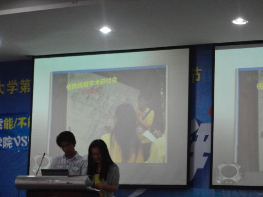 的青协展示首先以一系列数据引出一年里开展的志愿者社会实践活动,并列举了个人及集体的荣誉奖项,由此向大家展示了外院青协在过去一年里对志愿服务坚持不懈的努力。在风采展示过程中,主持人还穿插了三个抽奖环节,使现场气氛大为活跃。