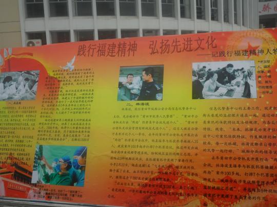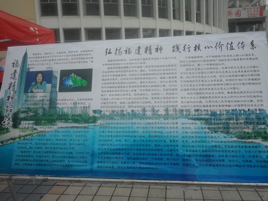 在活动现场记者看到,一条横幅挂在现场的帐篷周围,横幅上写着福建精神