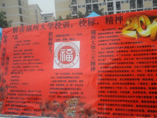 、福大校训、校标和精神、福建精神和先进人物进行介绍和解读。福建精神既反映了福建独特的历史文化底蕴,又体现了时代发展的新要求。在大力弘扬以爱国主义为核心的民族精神和以改革创新为核心的时代精神,践行社会主义荣辱观的同时,大力弘扬和发展福建精神更有利于打牢福建人民团结奋斗的共同思想道德基础。先进典型人物如中科院院士吴孟超、优秀人民警察林海波等等的介绍也为同学们树立了学习的榜样,引导他们积极进取。此次活动最大的亮点是将福大精神与福建精神进行了很好的结合。福大精神中“艰苦奋斗”和“严谨求实”是建立在福建精神中“爱国爱乡”的基础之上;而福大精神中“勇于拼搏”与福建精神的“敢拼会赢”又有异曲同工之妙;“海纳百川”同样适用于福大学子,学习时应有海一样的胸襟吸收广博的知识。