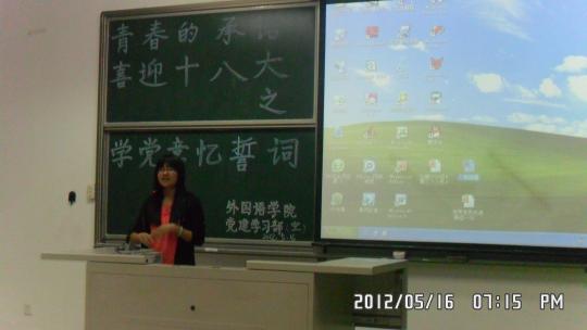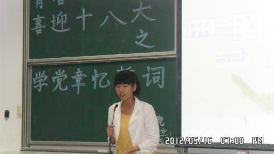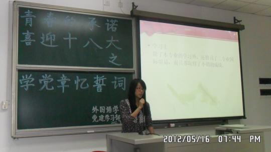 此外,党建部、各班级也积极组织开展理论学习活动。其中,党建部向外国语学院各团支部分发《社会主义核心价值体系学习读本》及十八大宣传材料,让同学们深入学习其科学内涵,加强对党员,入党积极分子的先进性教育,理念信念教育等,喜迎党的十八大。