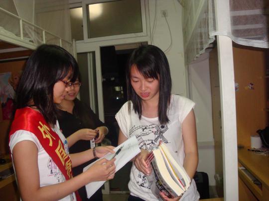 尽管雨下的很大,党建学习部的志愿者们还是早早就来到活动室布置场地。接着活动负责人简单介绍活动过程,并将志愿者们分成2组。之后,她又对志愿者们交代礼貌等细节问题。在认真的教导后,志愿者郭佳丽等人带着收书籍用的箱子,表格等到13号楼6楼宿舍进行走访,回收毕业生捐赠的爱心书籍。2组志愿者礼貌敲门,诚恳询问,最后获得喜人结果。