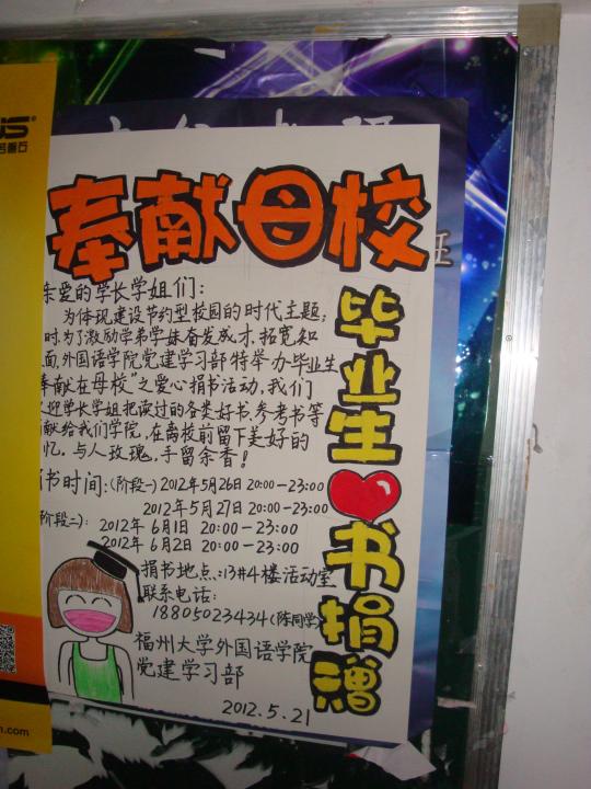 为了合理有效利用资源,实现资源共享,5月26日晚8时许,外国语学院党建学习部在13号楼4楼活动室举办毕业生“奉献在母校”之爱心书捐赠活动。