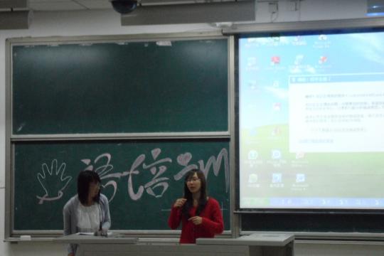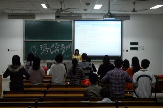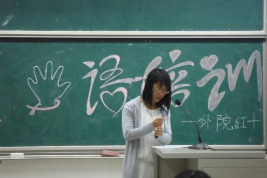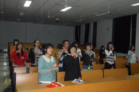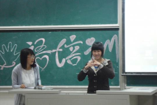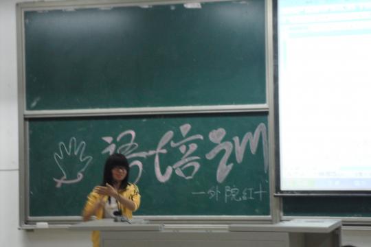 4 月14日 晚七时许,由外国语学院红十字会主办的“手语培训讲座”在文2-105举行,参加本次讲座的有外国语学院学生和院红十字会部员。讲座邀请校红十字会的郭小莉,康伟玲和陈飞朝三位同学对同学们进行手语培训。
