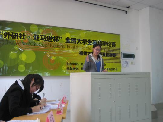 主持人正式宣布比赛开始,各位参赛的选手就坐完毕后,正反双方一一陈述了自己的观点。第一场的比赛进行了四十多分钟,参赛人员走进观众席等待结果。接着,第二场比赛开始,辩题也随之变换了,第二场辩论达到了高潮,精彩再次升级,他们一口流利的英语使在座的许多同学都投去崇拜的目光。经过两轮的精彩角逐之后主持人宣布比赛成绩,来自八方物流学院的石翰和许丽丽凭其精彩的表现夺得第一名,外国语学院的林语嫣和孙芷云名列第二,外国语学院的吴雪晨和王语嫣及材料学院的吴天瑜和陈斌并列第三。除此之外,外国语学院的孙芷云和王语嫣分别获得个人奖项中的最佳辩手奖和最佳台风奖。