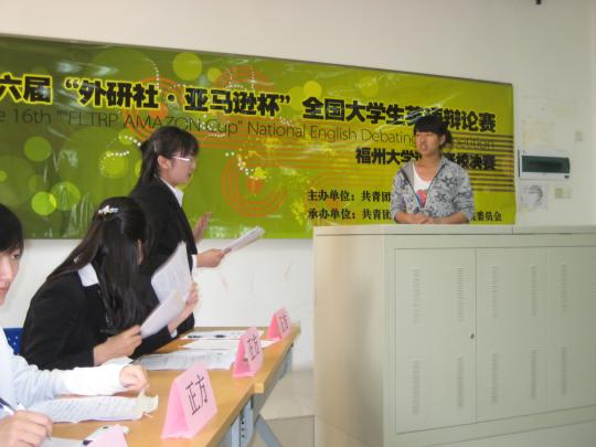 委员会主办,外国语学院承办的第十六届“外研社.亚马逊杯”全国大学生英语辩论赛决赛于西2-303拉开帷幕。此次辩论赛共有四支来自不同学院的队伍参加。参与此次辩论点评的评委老师有梁向辉、付磊及林菲。