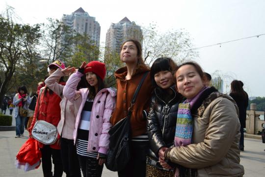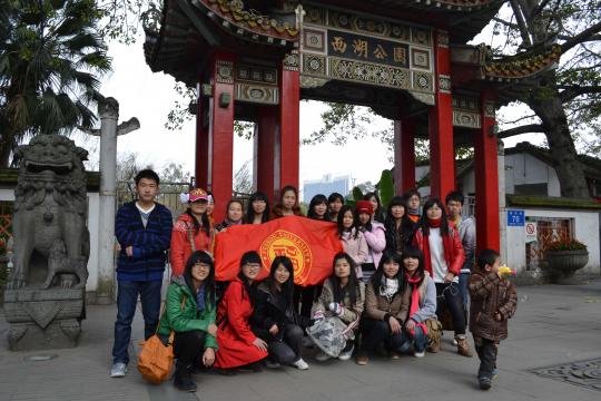 饱览美景之余,还有趣事趣闻点缀其右。凤英同学稚气未脱,装扮阿拉蕾,正和这春景新气象,让人耳目一新。在长廊小憩期间,有农大学生误以为我们是中学生,拿中学生调查给我们填,左右相觑之后不由哈哈大笑,确乎我们的衣着也显年轻两分。在西湖门口照“全家福”时状况百出,郭馨同学兴奋地拿出班旗,才发现这是哪门子的班旗,分明是暑期社会实践的队旗,原来昨个班长彩梅拿时没看清楚一股脑地就塞进包里,最后把旗子七卷八折的才合影。经过李白雕塑时,同学们都亲切地叫他“小白”,甚至彩梅同学还学他的样子来了个现场版COSPLAY,别有韵味。为了照顾班里的三个仅有的男丁和转专业的宇凡童鞋,吃不完的通通拿到他们面前,“恶言”威胁他们解决掉,分明就是把他们当成收纳盒嘛~野餐后就是午休的点了,同学一仰头就躺在了布上,接着春光美景来个草地日光浴。这一排绝对景象壮观!