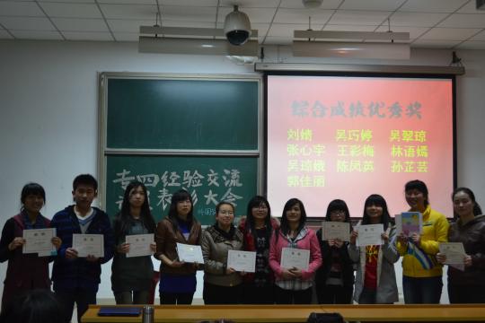 在掌声中送走学长学姐之后是激动人心的学业表彰环节,主要是对大二上学期学习表现突出、学习进步较大的同学进行鼓励,希望全班同学能在接下来的考试里齐心协力,齐首共进。设置的“综合成绩优秀奖”“单科成绩优秀奖”“学习进步奖”等奖项逐一公布,花落各家。在隆重的颁奖音乐声和“朴实无华”的颁奖嘉宾的衬托下,每个领奖的同学都显得容光焕发。在颁奖的最后留有一个悬念,上学期的学习特别奖——“学习成绩突出奖”颁给刘婧,以表扬她治学严谨的学习作风和独占鳌头的学业成绩。我相信,在成功的背后是每个同学艰辛的付出。天道酬勤,我们将在未来每一天的学习里发扬敢拼会赢的福建精神,专心备考、全力以赴。