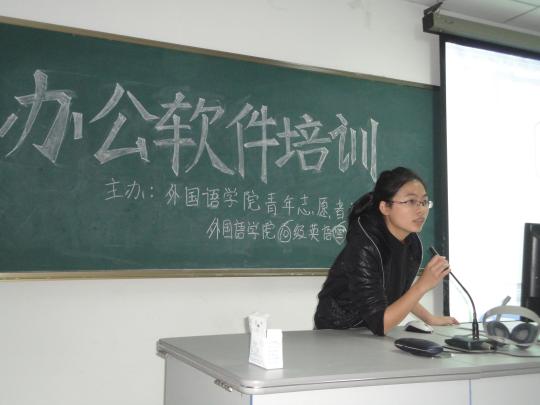 12月15 日18时许,办公软件培训在外国语学院408开展。本次培训由外国语学院青年志愿者协会主办,外国语学院英语3班承办。参加了本次培训的有青年志愿者协会的成员们与10级英语3班的同学们。本次培训会由青年志愿者协会的副会长郭馨担任主持。