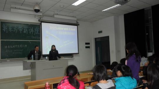 12月22日晚上6时,由外国语学院主办、福州新东方学校承办的新东方暑期带薪实习讲座在文一105圆满举行。此次宣讲会由新东方工作人员担任主讲,主要针对2012年暑期带薪赴美实习项目进行讲解,旨在通过此次宣讲会为同学们提供暑期实践的机会。