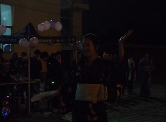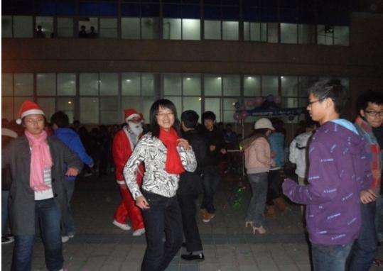 德国印象协会的缤纷圣诞树,飞扬舞协会帐篷中梦幻气球,广场上炫彩灿烂的彩灯,人群中穿动的圣诞帽,营造了一派浓郁的圣诞气氛。一场轻快活泼的爵士舞拉开了舞会的序幕。富有感染力的节奏,优雅的舞步,外国语学院的三位女生以独特的风格迅速点燃了现场的热情。随后外国语学院的男生也倾情献唱。《春天》、《Pieces》和他们改编的《Jingle Bells》,在富有磁性的电吉他声中,为伫立在寒风中的观众们送上了温暖的气息。樱花日协的舞蹈表演也让人眼前一亮,赢得了现场观众的阵阵叫好。接着,飞扬舞协会教观众们跳恰恰舞。富有激情的旋律将舞会气氛推向高潮。不少同学起初有些害羞,但抵挡不住音乐的感染力,跳舞的人群逐渐壮大。周杰伦的《彩虹》让不少同学牵起舞伴的手,随着柔美而深情的音乐踱步、旋转。轻松愉悦的《快乐崇拜》、俏皮可爱的兔子舞更是让广场上空笑声不断。21时30分左右,主持人宣布舞会结束,人群才恋恋不舍地散去。