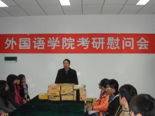 会议伊始,刘旺副书记发言讲话。他首先分析了目前严峻的就业形势和福建省未来的经济发展形势,申明同学们选择考研的正确性与主动性。通过考研这一条路,同学们把握了人生中的一次重要机会,为各自今后的人生发展提供了更多的选择。同时在准备考研的过程中,大家在充实自我的同时,也锻炼了克服困难和抵御诱惑的能力,获得一笔宝贵的成长经验。刘旺书记表示,学院是所有考研同学的强大后盾,学院将会尽一切努力为大家创造良好的考研条件。面对即将奔赴考研战场的学子,刘旺书记也代表外国语学院全体师生,向他们送上鼓励与祝福,祝愿他们在考试中能沉着冷静,顺利发挥出自己应有的水平,实现自己的研究生梦。而学院也对顺利考上研究生的考生设有相应的鼓励机制,希望以此激励考生奋勇拼搏,创造学院佳绩。最后,刘旺副书记送上了新年祝福,会场气氛轻松活泼。此次慰问会学院还准备了一些慰问品给备考考生们,同学们依次从刘旺副书记手中领取了考研笔袋和一箱的“谷粒谷力”。现场考生表示,这场慰问会让他们感受到学院对他们的支持与鼓励,希望能顺利通过考试,为学院争光。