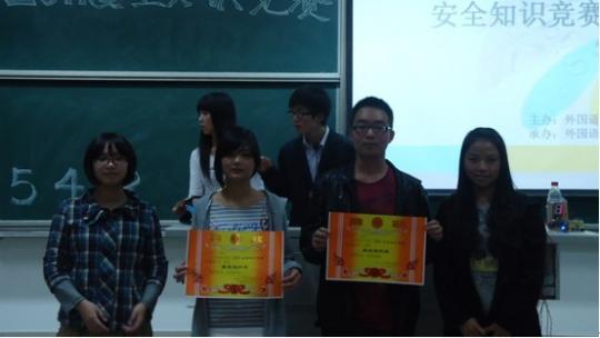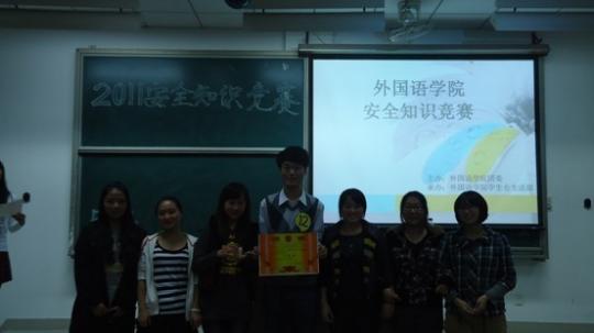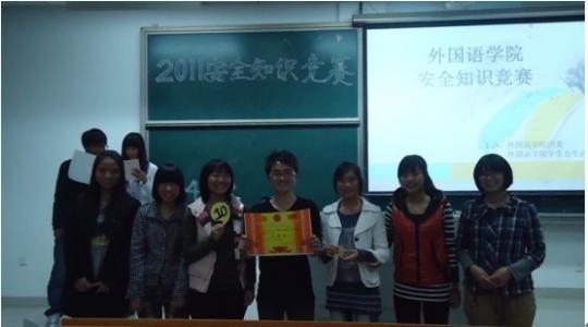 本次知识竞赛分为三个环节,共有17支队伍参赛。在简短的自我介绍后,第一轮必答题环节“步步为营”正式开始。参赛队伍通过亮出选项牌来回答选择题和判断题。经过五轮紧张的比拼较量,8支队伍进入第二轮“激情似火”——抢答题环节。在这一个考验选手反应能力的环节中,有的队伍发挥出色,凭借敏捷的反应和队友们默契的配合连连得分;也有选手似乎太紧张,因抢答错误而失去领先的优势。赛场上的风云变幻让在场的同学们时而鼓掌欢呼,时而顿足叹息,赛场气氛逐渐升温。在惊险刺激的抢答环节后,4支队伍晋级决赛。在第三轮“惊心动魄”环节中,面对“牛刀小试”、“游刃有余”、“谁与争锋”三种选择,选手们施展出浑身解数。有的队伍沉着稳重,有的队伍胆大心细。最终,霹雳队从中脱颖而出,勇夺桂冠。晴天队紧追其后,获得亚军,101队和灵灵五队也取得三等奖的好成绩。11级日语1班和11级英语1班获得最佳组织奖。