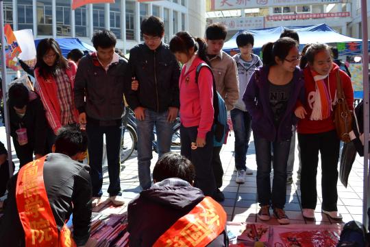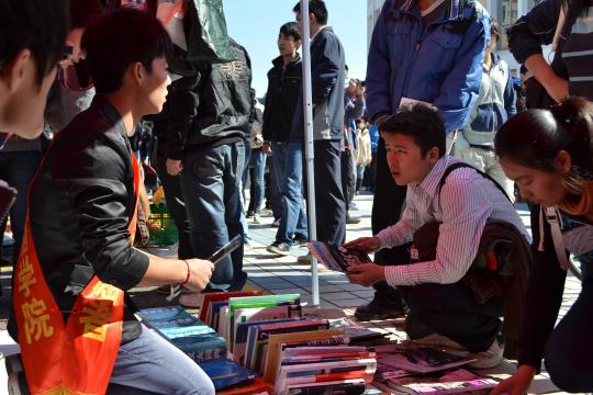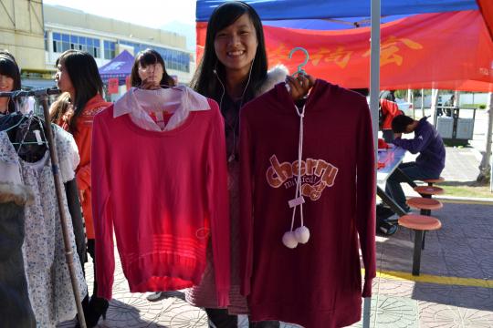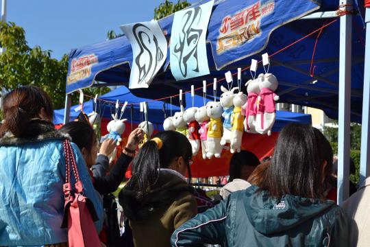 为了吸引顾客,外国语学院制作了多张精美的海报和饰品,吸引不少路人驻足。除了外国语学院,各学院也都煞费苦心,志愿者们积极地向路人推荐自己的商品,还未等路人靠近,热心的志愿者们便开始了叫卖,广场上的气氛不断升温。冬日的阳光暖暖地照着,一股暖流在买卖者之间涌动。