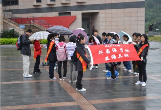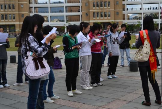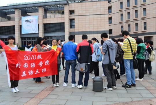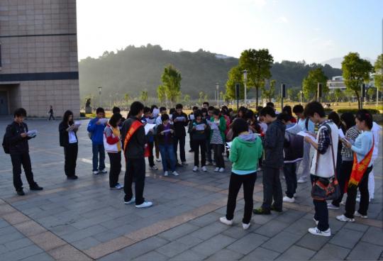 外国语学院10级英语3班团支部携手管院口协在图书馆前的福万广场举办了为期一周的晨读倡导活动。此次活动以倡导福大学子积极学习英语为目的,通过晨读搭建英语专业学生和非英语专业学生共同学习的平台,把英语学习的方法分享给有意学好英语的同学,,为福大营造一个浓厚的英语晨读氛围。