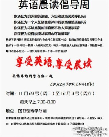 10英三团支部多方吸取意见,集全班同学的智慧,制定初步的晨读的形式:以一篇激励人心的演讲、一篇四、六级考试范文以及各种训练口语的小形式作为晨读内容。活动前,班长和团支书调动全班同学的积极性,采用地毯式宣传,不仅在生活区的宿舍楼张贴宣传单,还通过大众喜闻乐见的新形式如班级微博、个人空间进行大力宣传。特别的是,微博宣传得到校微博协会和各个兄弟班级以及上级领导老师的大力支持,获得极大成功。