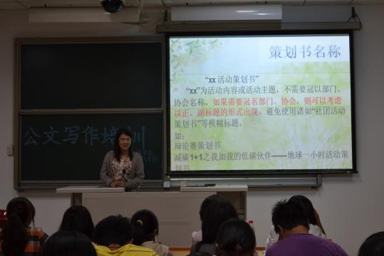 在主持人对此次培训的流程进行简单介绍后,外国语学院的黄玉洁同学介绍了公文写作课程,主要涉及到计划,总结和策划的撰写。她的讲解浅显易懂,操作性强,深入浅出,令在场同学对公文写作有了一定的了解。在随后的观众提问环节中,大家纷纷发言,玉洁同学对在场同学的提问进行一一解答。