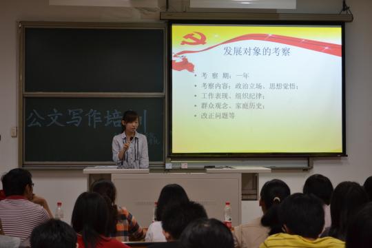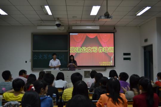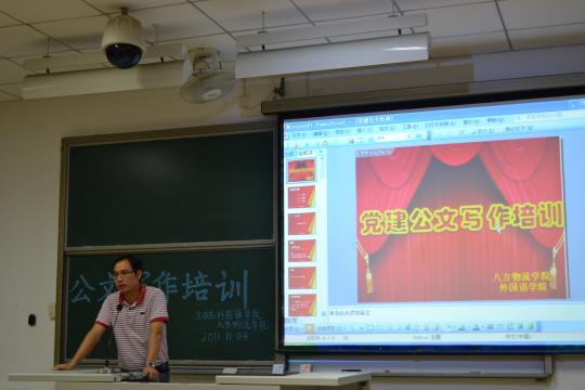 11月4日19时许,由外国语学院党建部和八方物流学院党建部共同主办、2010级英语3班承办的公文写作培训在文1-305举行。八方物流学院团委书记、辅导员蓝荣聪老师、外国语学院团委副书记陆婉莉、外国语学院党建部部长林珊珊、八方物流学院党建部部长王琳、物流学院党支部本二支部党员代表出席了此次活动。