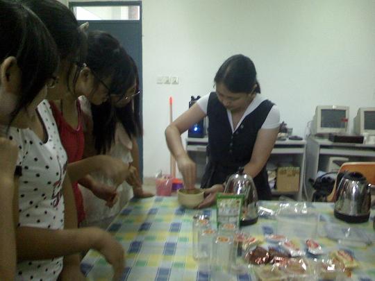 活动伊始,潘秀蓉老师首先以PPT和播放视频的形式向同学们介绍关于茶道的起源历史、茶道的礼仪和注意事项,比较中日两国茶道的不同,体会日本独特的茶文化,感受茶文化"和敬清寂"的精神内涵。接着,潘秀蓉老师一边细细讲解一边从容而不失优雅地亲自演示点茶、煮茶、冲茶、献茶四个环节,向同学们展示了茶道表演复杂的流程和规范。在场同学看的赞叹不已,一个个都跃跃欲试。随后,在潘秀蓉老师的指导下,同学们开始自己动手操作,并品尝点心。